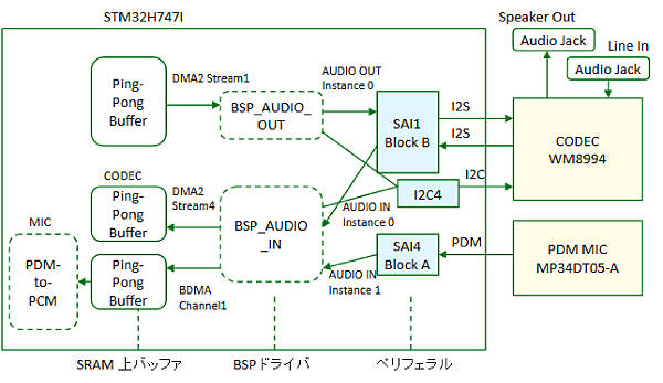 図2 STM32H747I ボード上のオーディオ・データ・パス