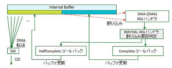 ここでは録音バッファの半分あるいは全部が書き込まれたとき、DMA 割り込みが発生するように設定されています。割り込みでは録音バッファを転送中と転送済みの2 つに分け、プログラムから操作して問題ない転送済みバッファのデータ処理を行います(いわゆる Ping-pong Buffer)。このように、バッファを交互に使いながら書き換えたり読み出すことで、長時間のデータを処理落ちなく扱うことができます。