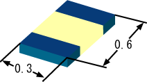 抵抗、コンデンサなどのリードがない表面実装部品です。部品の外形寸法が0.6×0.3mmのため0603型と呼ばれています。