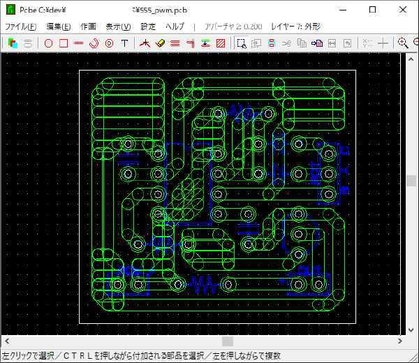 レイヤ5とレイヤ6の「シルク-A」(表面シルク)やレイヤ7の「外形」を表示させると、回路図と照合や基板全体との位置関係の確認が容易になります。