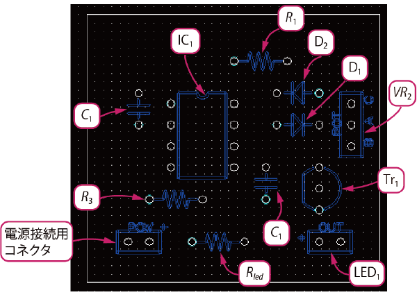 前回(第2回)は、入手性のよい汎用のタイマIC 555を使って、高輝度LEDを駆動する実験用のスイッチング電源の回路を設計しました。今回は、何百万円もする高価な業務用ツールではなく、電卓のように気軽に使えるお絵描きツール“PCBE”を使って、プリント基板のパターン・データを作ります。次回は、家庭用のインクジェット・プリンタでフィルムにパターン・データを印刷し、感光基板で焼き付け後にエッチングして銅箔パターンを作ります。