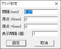 メニューから[設定]-[グリッド]を選びます。または、グリッド設定のアイコンをクリックすると、グリッドの設定ダイアログが開きます。