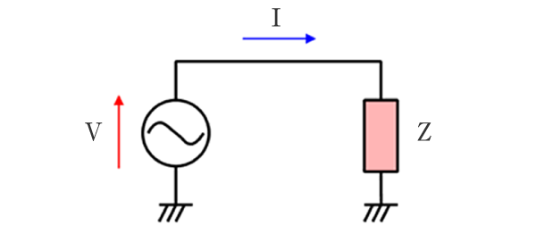 図1 に示す回路において、インピーダンス$Z$は式\eqref{eq:impedance}で表され、その値は回路に加わる電圧$V$と、回路を流れる電流$I$の比によって求めることができます。