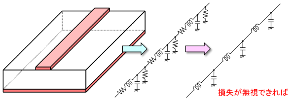 実際の伝送線路は、損失を無視できる微小区間が連続したものなので、等価回路は 図3 のように表せます。