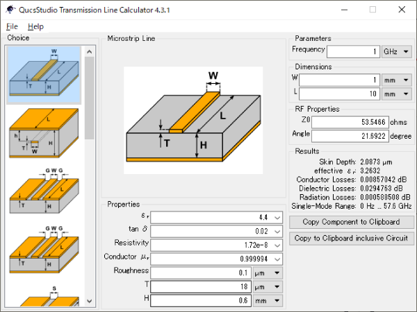 計算ツールに基材の基本特性である誘電率や、物理寸法を入力すると、特性インピーダンス$Z_0$が表示されます。