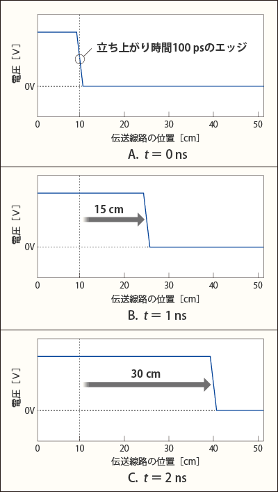ディジタル信号がMSLを伝搬していくようすを図2に示します。立ち上がり時間100 psのエッジは1 nsごとのスナップ・ショットで見ると、受端に向けてA, B, Cと、まるで波が伝わるように電気信号として伝搬していきます。繰り返し周波数が高速でなくても、エッジ変化が高速であれば、このように信号を「波」として考えるべきです。